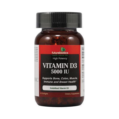 Enjoy FutureBiotics Vitamin D3 - 5000 IU - 90 Softgels every day at these amazing prices! Futurebiotics Vitamin D3 Description: Supports Bone, Colon, Muscle, Immune and Breast Health Solubilized Vitamin D3 High Potency Vitamin D is a fat-soluble, essential nutrient for the body. Vitamin D is produced through skin exposure...